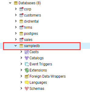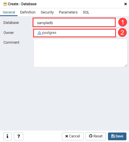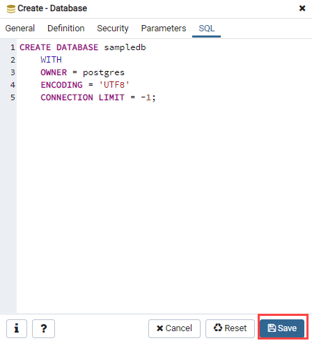 In this example, we create a new database called sampledb and owner postgres.