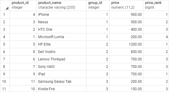 In this example, the PARTITION BY clause distributed the products into product groups. The ORDER BY clause sorted products in each group by their prices from high to low to which the DENSE_RANK() function is applied.