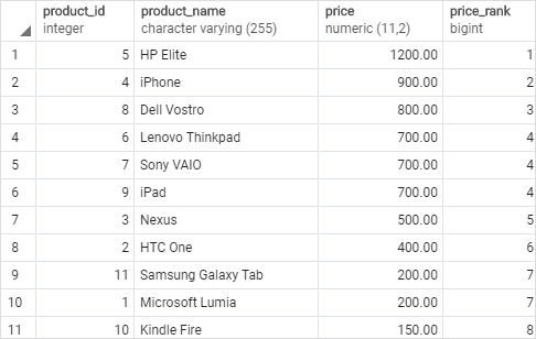 The DENSE_RANK() function assigned a rank to each product based on the price order from high to low specified by the ORDER BY clause.